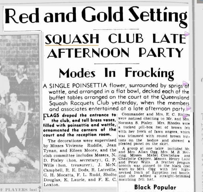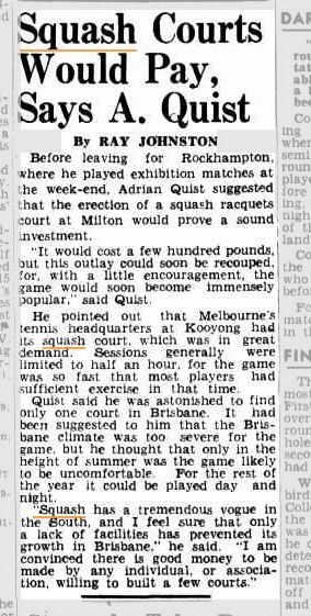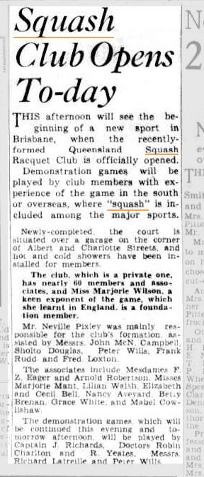 The first Squash Court in Brisbane opened on the 15th of September 1938, located on the corner of Albert and Charlotte Street in Brisbane Central and was known as Queensland Squash Racquet Club. The club was situated over a garage, and was just a single court with 60 members. - See articles below.